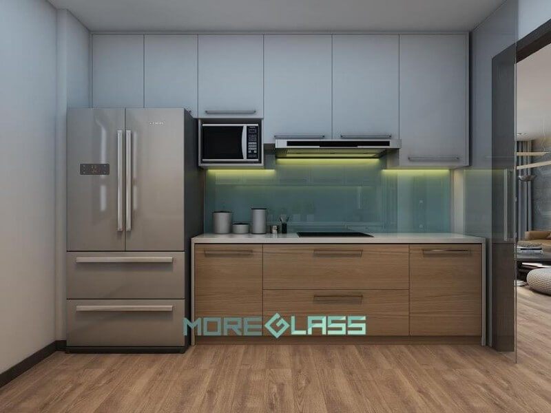 Sắp xếp mẫu kính ốp bếp màu xanh ngọc nhẹ nhàng, hiện đại cho không gian nhà bếp nhỏ ở chung cư.