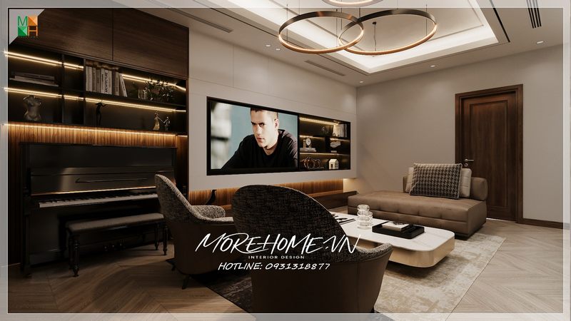 Morehome đề nghị một mẫu thiết kế nội thất cho phòng khách của căn hộ chung cư, nhà phố tiện nghi và có phong cách tân cổ điển sang trọng.