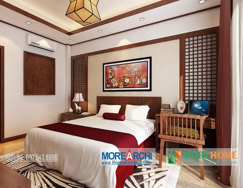 Không gian phòng ngủ được trang trí bằng nội thất gỗ tự nhiên giúp tạo ra sự ấm áp và đơn điệu.
