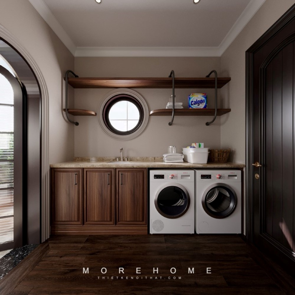 Sử dụng tối đa diện tích và công năng của mẫu tủ Logia bằng cách kết hợp nó với mặt đá chậu rửa và ban công phơi đồ.