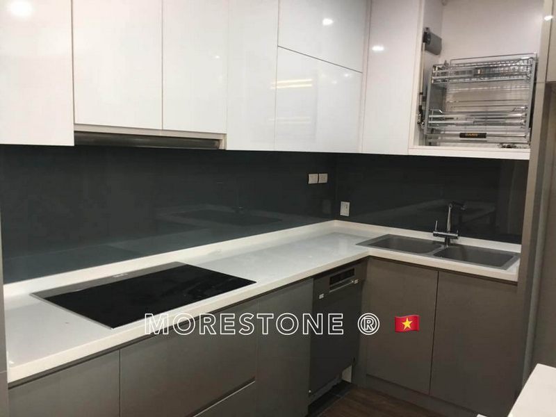 Thiết kế và thi công nội thất phòng bếp với diện tích nhỏ, tông trắng làm chủ đạo và kính ốp bếp màu be đậm MG-020 là điểm nhấn.